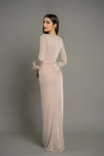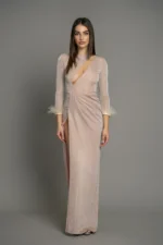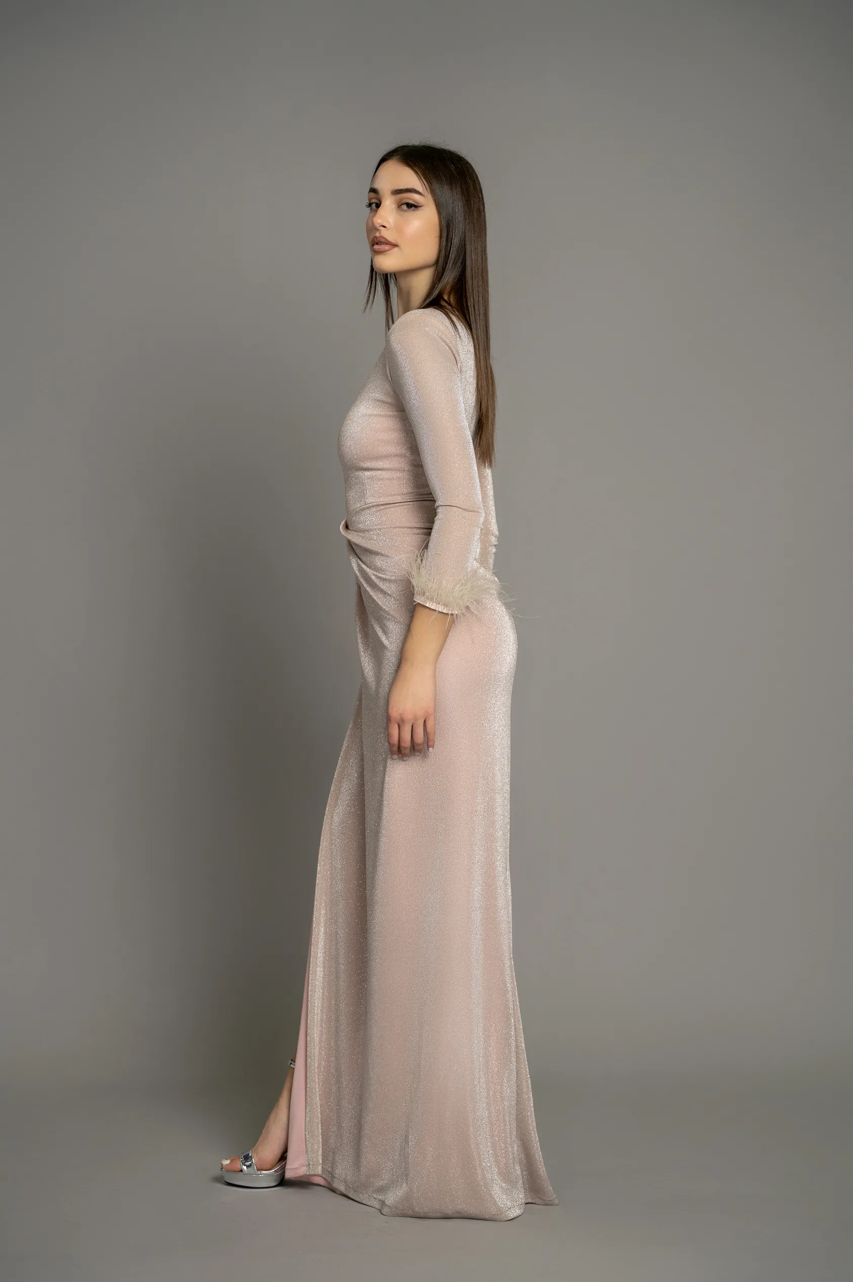 Μάξι ελαστικό φόρεμα με γκίττερ ύφασμα, χαρακιά στο στήθος, βατές στους ώμους και πούπουλα στο τελείωμα του μανικιού. Ράβεται κατόπιν παραγγελίας στο χρώμα της επιλογής σας.