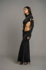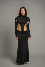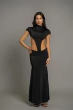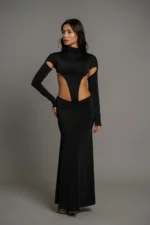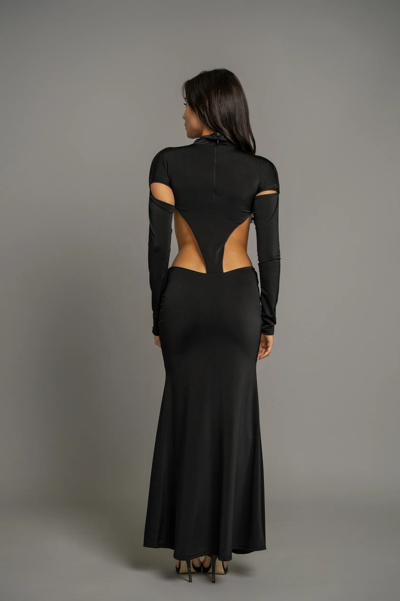 Ελαστικό μάξι cut out γοργονέ φόρεμα με αποσπόμενα μανίκια. Ράβεται κατόπιν παραγγελίας στα μέτρα σας και το χρώμα της επιλογής σας.