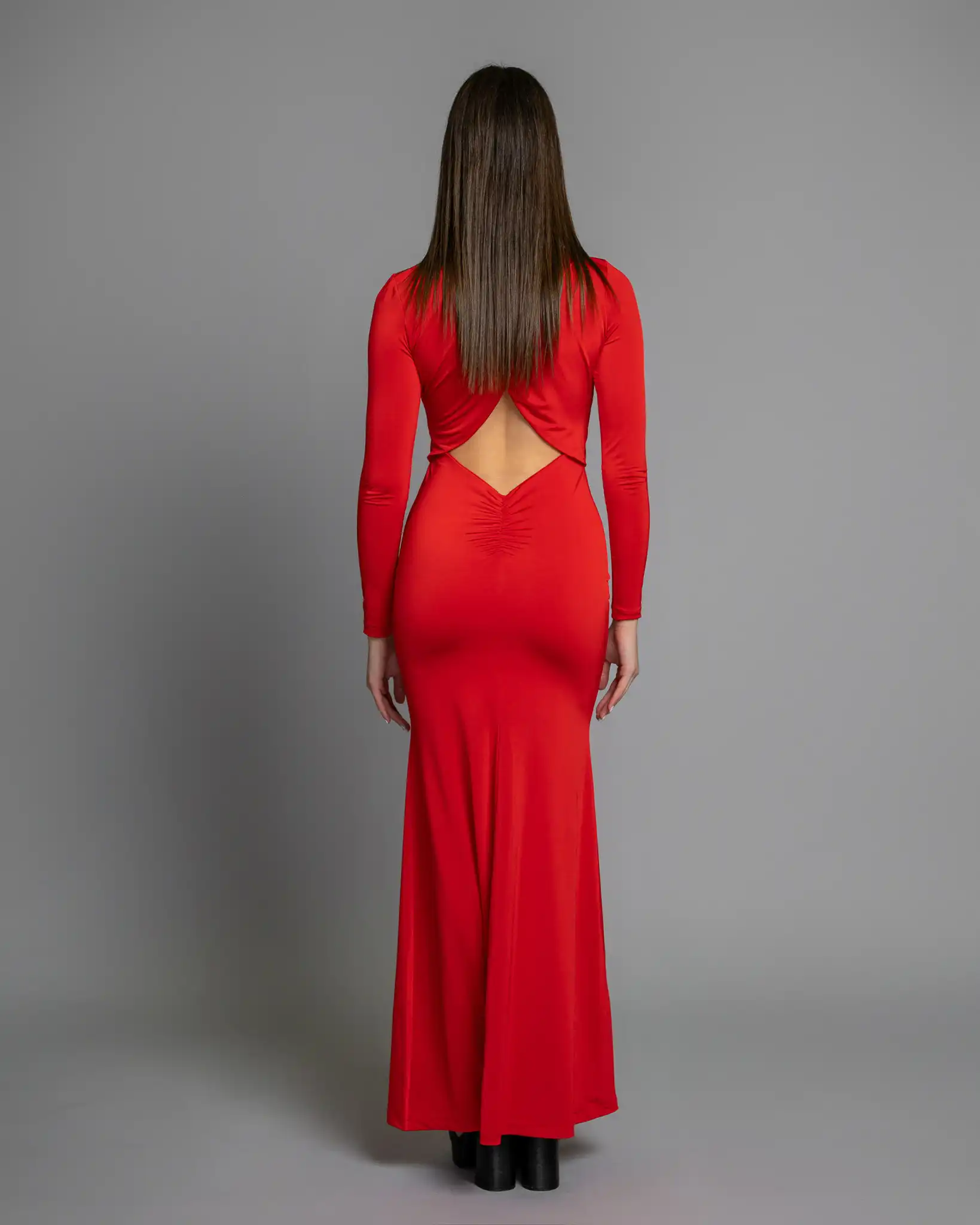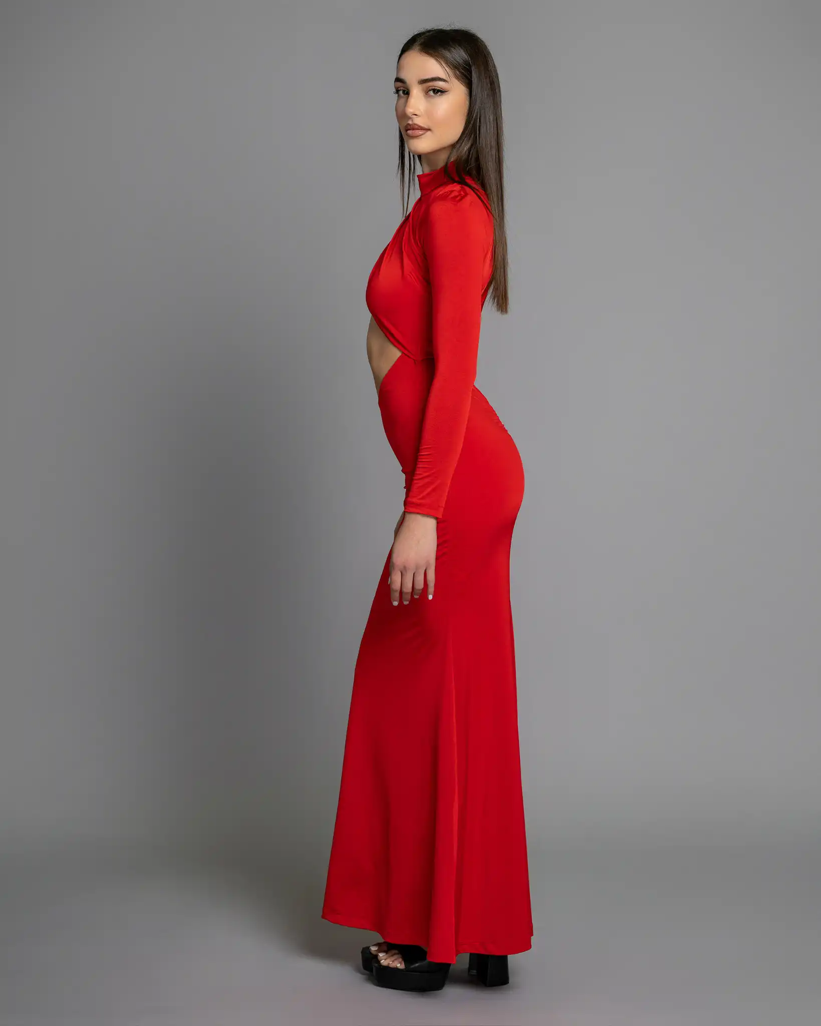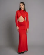 Ελαστικό μάξι φόρεμα cutout με γοργονέ ουρά. Ράβεται κατόπιν παραγγελίας στο χρώμα και το ύφασμα της επιλογής σας.