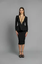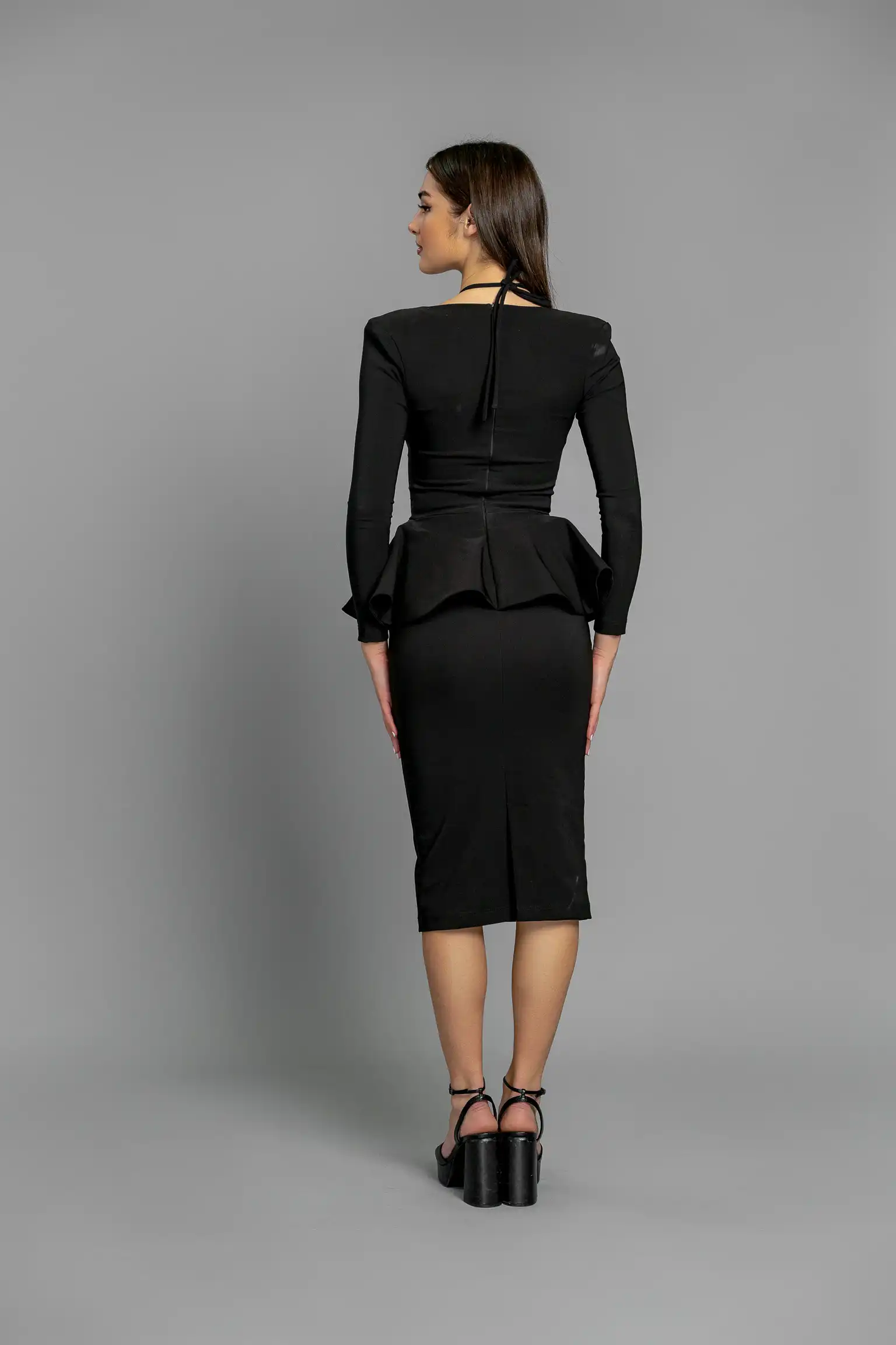 Midi φόρεμα με βαθύ ντεκολτέ και βολάν σε PRADA ύφασμα. Ράβεται κατόπιν παραγγελίας στο χρώμα, το ύφασμα της επιλογής σας και στο μέγεθος σας.