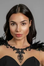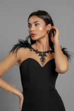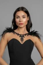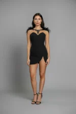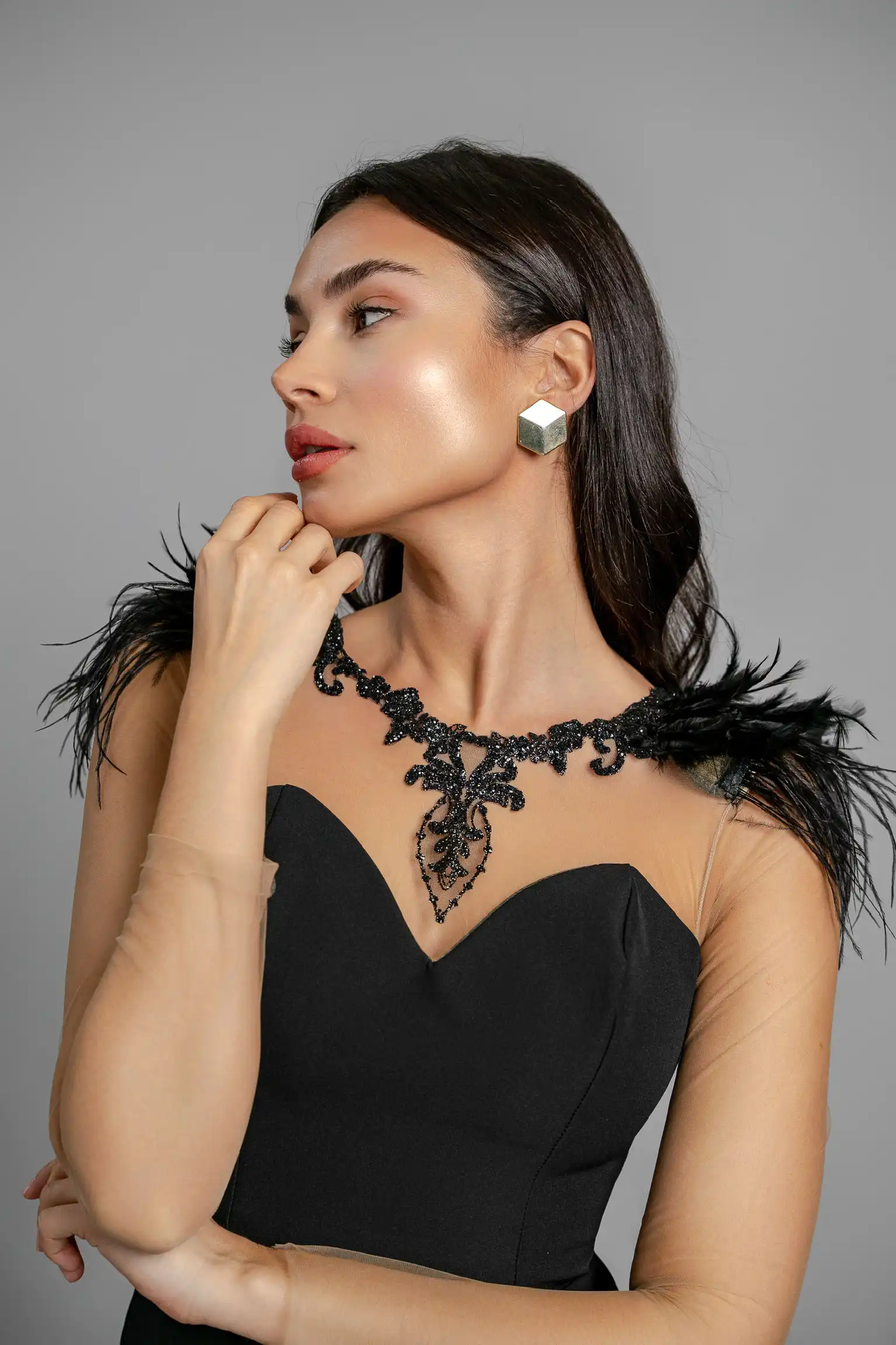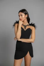 Μίνι φόρεμα σε PRADA ύφασμα με κέντημα στο στέρνο με πούπουλα και βάτες στους ώμους. Ράβεται κατόπιν παραγγελίας στο χρώμα, το ύφασμα της επιλογής σας και στο μέγεθος σας.
